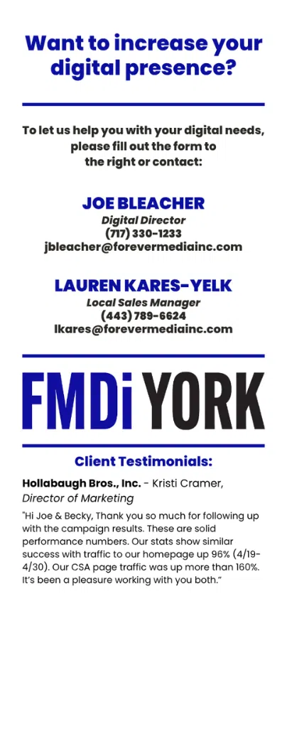 FMDi York can help promote your business and increase your sales. Our multi-platform approach includes radio, internet, digital, and mobile marketing strategies. This webpage is great for researching your options and our advertising capabilities. Let us know how we can help you grow your business.